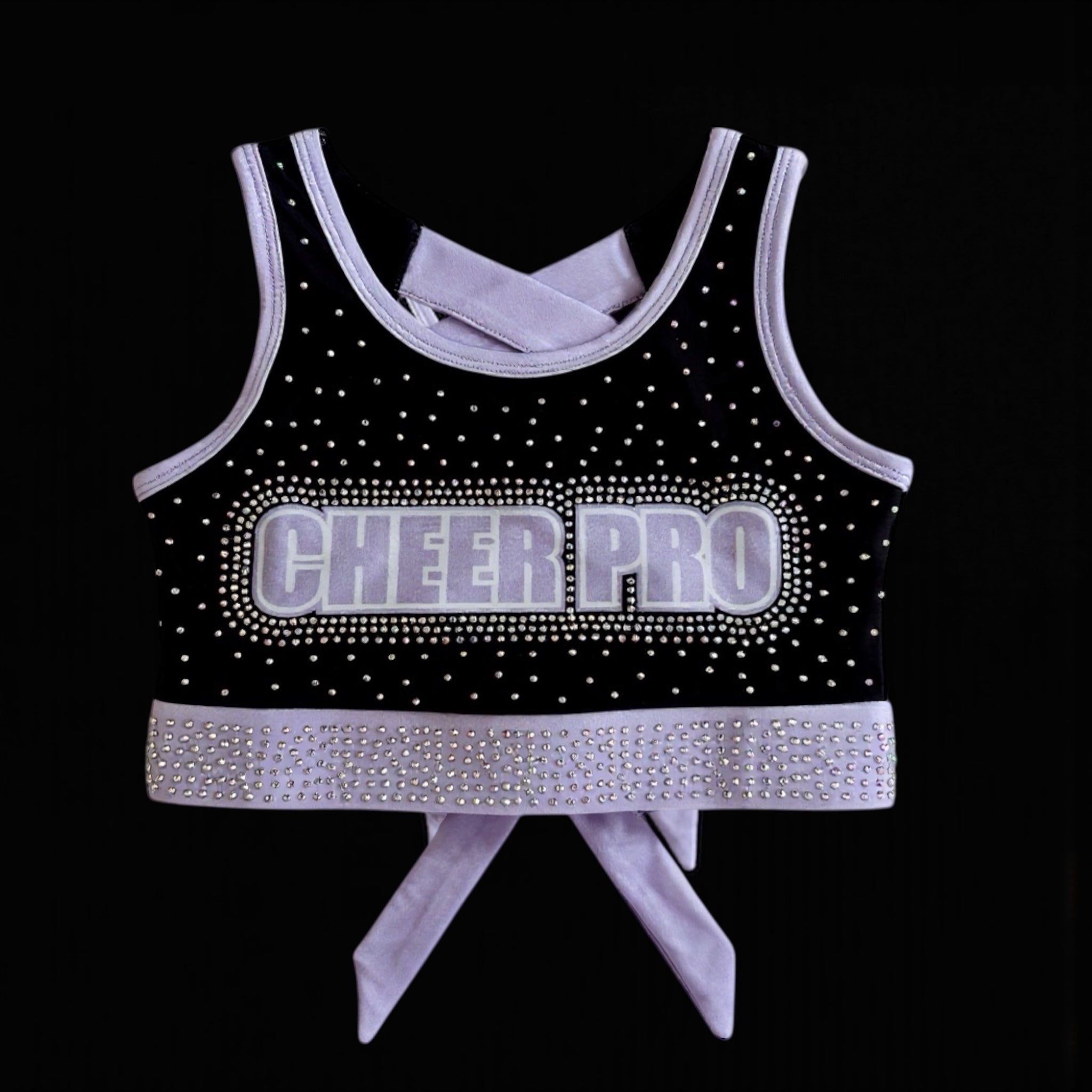The crop top offers a snug, supportive fit with a back design for full range of motion. Whether it's a high-energy routine or a high-fashion team look, this bling set brings the sparkle and spirit to every move.